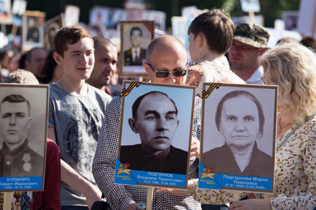 Moscow, Russia - 05 09 2018: Over one million people of all ages take part in the Immortal Regiment parade celebrating the memory of loved ones fallen in WWII after the state Victory Parade