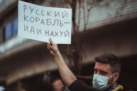 Lisbon, Portugal - February 27, 2022: a man is holding an offensive poster about Russian military ship while standing in the crowd of people protesting against aggressive invasion in the Ukraine
