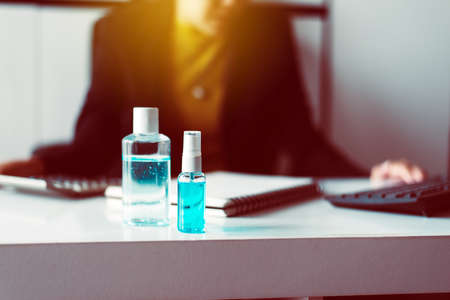 Sanitizer gel in spray bottle and hand sanitizer gel for coronavirus protection,Working at home,Work from home concept