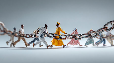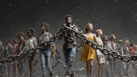 Conceptual image of group of people in chains. Mixed media