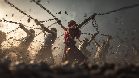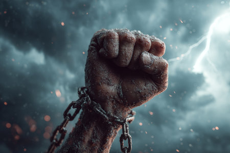Fist shattering chains against a dramatic sky, symbolizing freedom and triumph over oppression