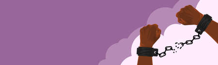 THE HANDS OF THE AFRICAN AMERICAN IN BROKEN CHAINS ON A PURPLE BACKGROUND