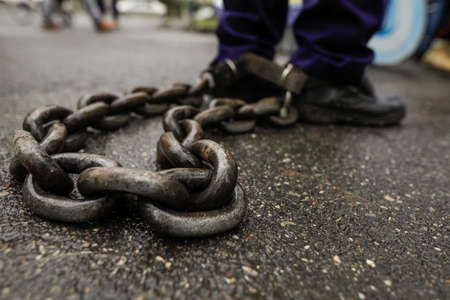 Victim, Slave, Prisoner male foor tied by big metal chain. People have no freedom concept image.
