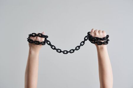 Woman hand holding onto a stainless steel chain. Woman's struggle conept idea