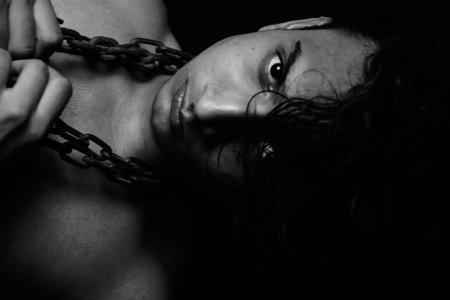 submissive chained woman, silver chain over her neck, bondage act concept on black background