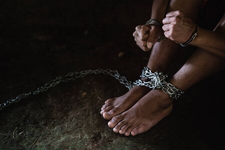Hopeless man foot tied together with chain, Victims of human trafficking