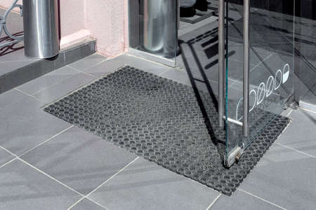 threshold made of gray ceramic stone tile at entrance to store with rubber foot mat and open glass door with metal handle and fastening loops at office building close up side view lit by sun, nobody.