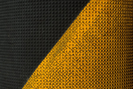 Grunge industrial room interior with safety yellow bumps panel on floor. Copyspace.