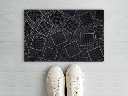 Designer Welcome Entry Doormat Placed on White Floor with White Shoes