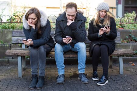 Friends sit together but all look at their phones. Group friends with social media concept. Group of people disconnected. Friends absorbed in devices. Technology silent distance.