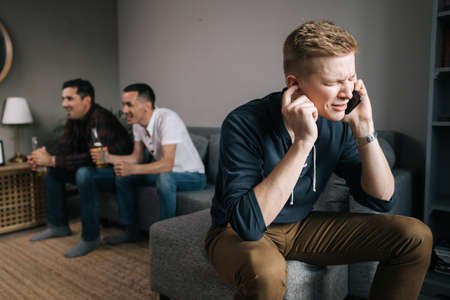 youny pleasant man in checked T-shirt is using his mobile phone while his friends are having fun. odd man in the company