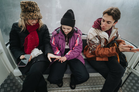 Three friends sitting together in a gondola, wearing warm winter clothing, interacting and enjoying the snowy outdoor experience