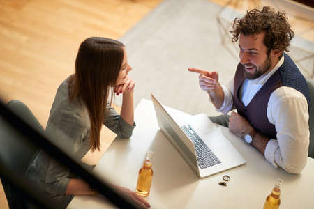 top view of young beardy caucasian male with curly hair smiling, pointing with index finger at his female colleague. Casual work from home due covid 19 lockdown