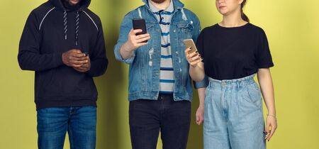 Group of friends using mobile smartphones. Teenagers addiction to new technology trends. Close up. Millenials texting, scrolling, chatting, watching video or shopping online. Connecting with devices.