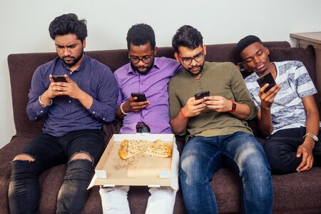 four african american males eating pizza at home party,looking at smartphone
