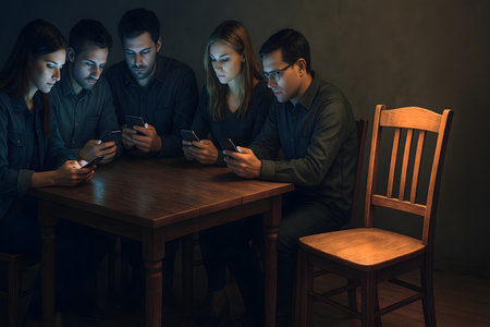 An impactful image depicting individuals isolating themselves with smartphones, symbolizing the mass numbing effect of social media.