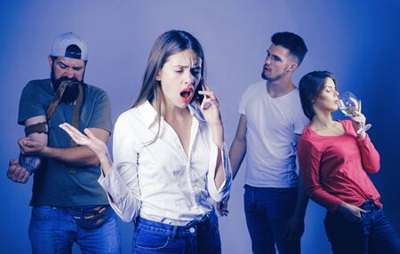 Bad habits or addiction. People suffering from alcohol and cocaine or tobacco addiction to behavior like selfie addiction. Group of men and women addicted to substance use and behavioral addiction