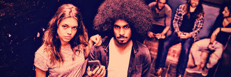 Group of young people standing in front of a grunge wall with a mobile phone hands