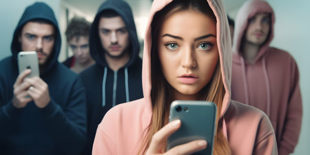 Two bullies threatening teenager boy and girl filming on phone. Cyber bullying and violence concept.