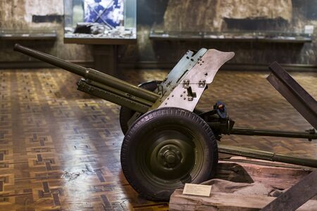 VOLGOGRAD, RUSSIA - 27 April, 2019: one artillery old gun is put on the central embankment of the city of Volgograd