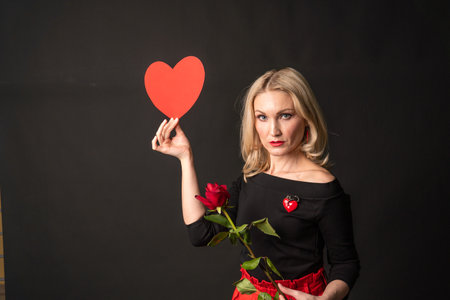 A woman holding a rose and a valentine red heart, a flirting board, on the floor hearts are a lovely space. February 14 banner.
