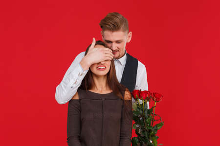 The guy from behind closes the girls hand to her eyes with a bouquet of roses on a red background