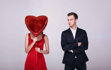 A serious young man in a suit and white shirt crossed his arms on his chest looking to the side at a young white lady in a red dress. The girl holds the red ball of the heart instead of the head.