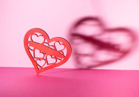 Abstract composition with two decorative hearts on pink paper background. Valentine day theme. Love and romance concept. Flat lay. Top view