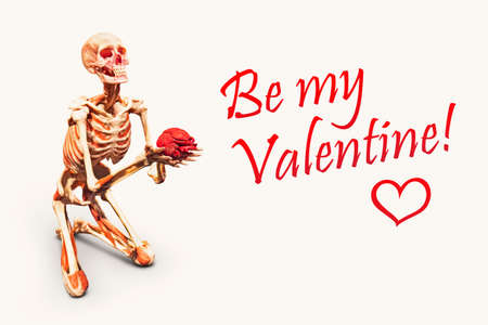 scary card Be my Valentine. skeleton keeps its heart isolated on a white background. Life, love and death concept. immortal love. marriage proposal