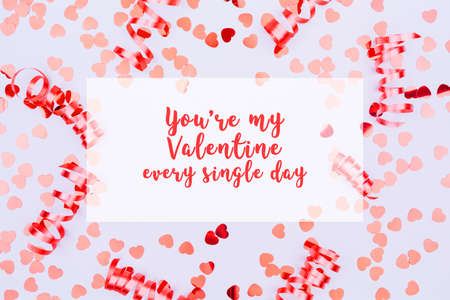 Red ribbons and glitter heart confetti. Valentine day concept. Festive flat lay design background. Horizontal with holiday Valentines text