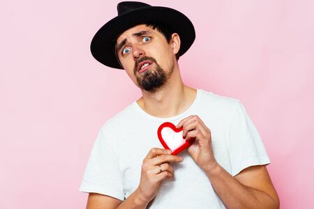 Surprised young girl with brown hair in a white t-shirt on a pink background and red heart. High quality photo