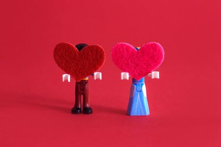 February 14 - Valentine's Day. Two toy men hold pink hearts on a red background. Love day concept in toy style, red background.