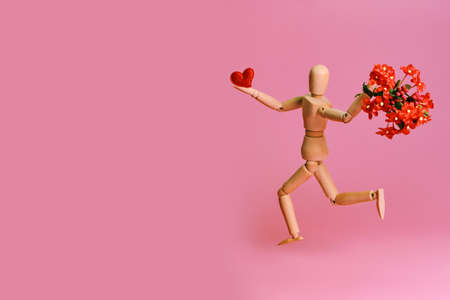 Running Wooden mannequin with a large bouquet of red flowers and heart on pink background. Concept proposal, engagement, declaration of love, Valentine's day or Mother's Day.