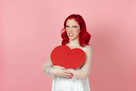 angry, disappointed, offended woman in white dress and with red hair holding a large paper red heart isolated on pink background