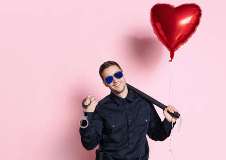 Young charming policeman officer with heart shape balloon wearing sunglasses isolated on pink background. St, Valentines day