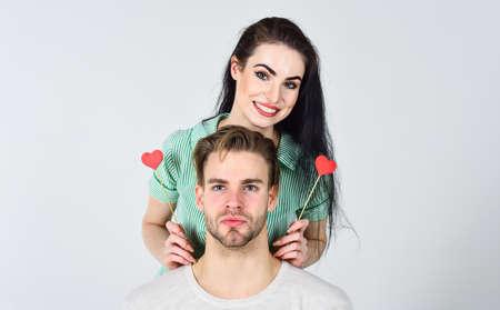 Happy together. Valentines day concept. Man and woman couple in love hold red paper heart valentines cards. Man and girl in love. Valentines day and love. Romantic ideas celebrate valentines day