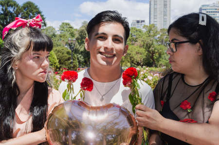 young latin caucasian man in a public park, sitting smiling nervous with flower and a heart balloon looking at the camera and two angry women looking at him. valentine's day concept.
