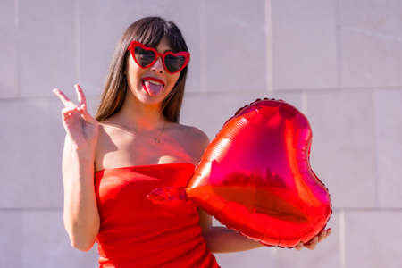 Caucasian brunette girl making the victory sign on Valentine's day with a heart balloon, sunglasses and red dress