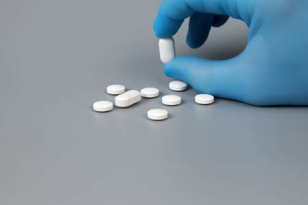 A man's hand in blue medical gloves takes a tablet with his fingers, on a blue background in close-up. Hand and pills