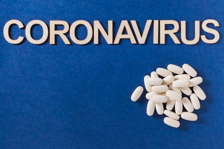 Coronavirus word with wooden letters and compressed medicine tablets on blue background