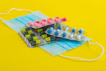 medicines and pills blue and white color on yellow background