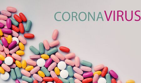 Stack of different pills isolated on grey background. Coronavirus - 2019-nCoV