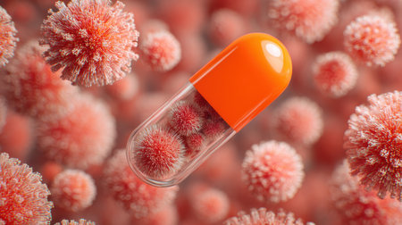 Close-Up View of a Capsule Containing Viruses Surrounded by Inflated Microbial Particles in a Gripping 3D Visualization of Germs