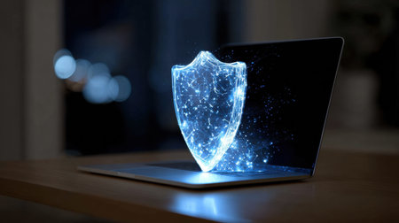 Digital security concept represented by glowing shield emerging from laptop screen, symbolizing protection and cybersecurity. image conveys sense of safety and technology