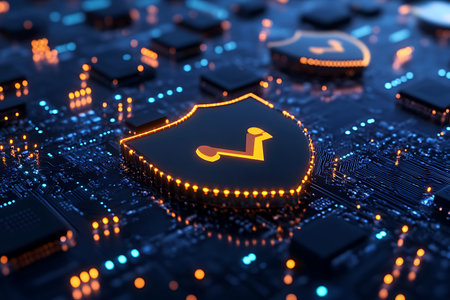 A shield icon glowing on an intricate circuit board, symbolizing security in the digital age. The design incorporates shades of blue and orange to convey trust and tranquility