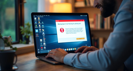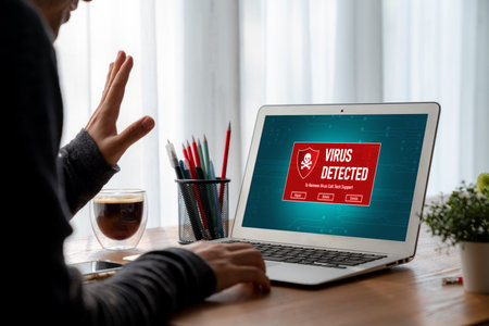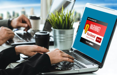Man using laptop with spam alert on screen, internet security concept, email inbox protection, cyber safety message, unwanted mail notification, electronic junk mail problem