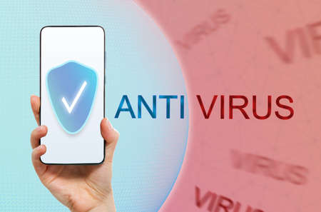 Hand holding protected smartphone on a light blue sphere. Red background with internet viruses. antivirus protection. Cyber security concept and cell phone apps.