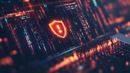 Futuristic laptop screen with glowing red shield icon and digital data flow. Concept of cybersecurity alert, digital protection, system warning, secure network technology.