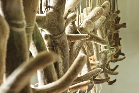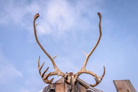 Close up of a reindeer massive antlers attached to the top of a wooden hut in native Sami people camp, Tromso region, Northern Norway