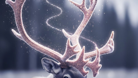 A stunning profile of a reindeer against a blurred winter backdrop, emphasizing its majestic antlers and soft fur in a peaceful, natural setting.